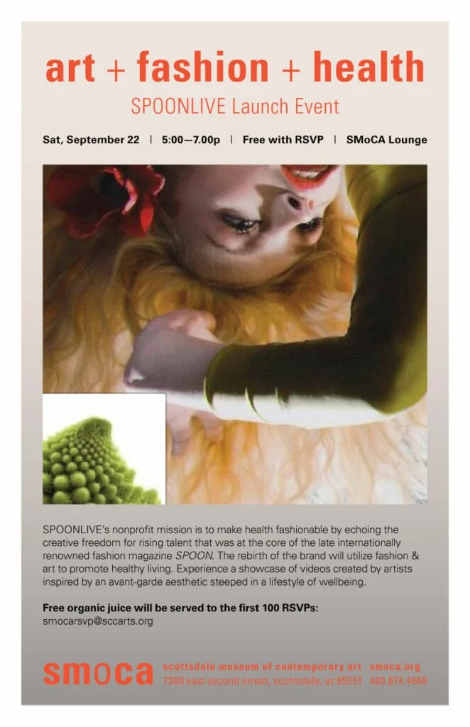 The nonprofit SPOONLIVE strives to make health fashionable. Its brand rebirth launched on September 22, 2012, at the Scottsdale Museum of Contemporary Art (SMoCa) stemmed from the late international fashion magazine SPOON, which supported creative freedom for rising talent.
